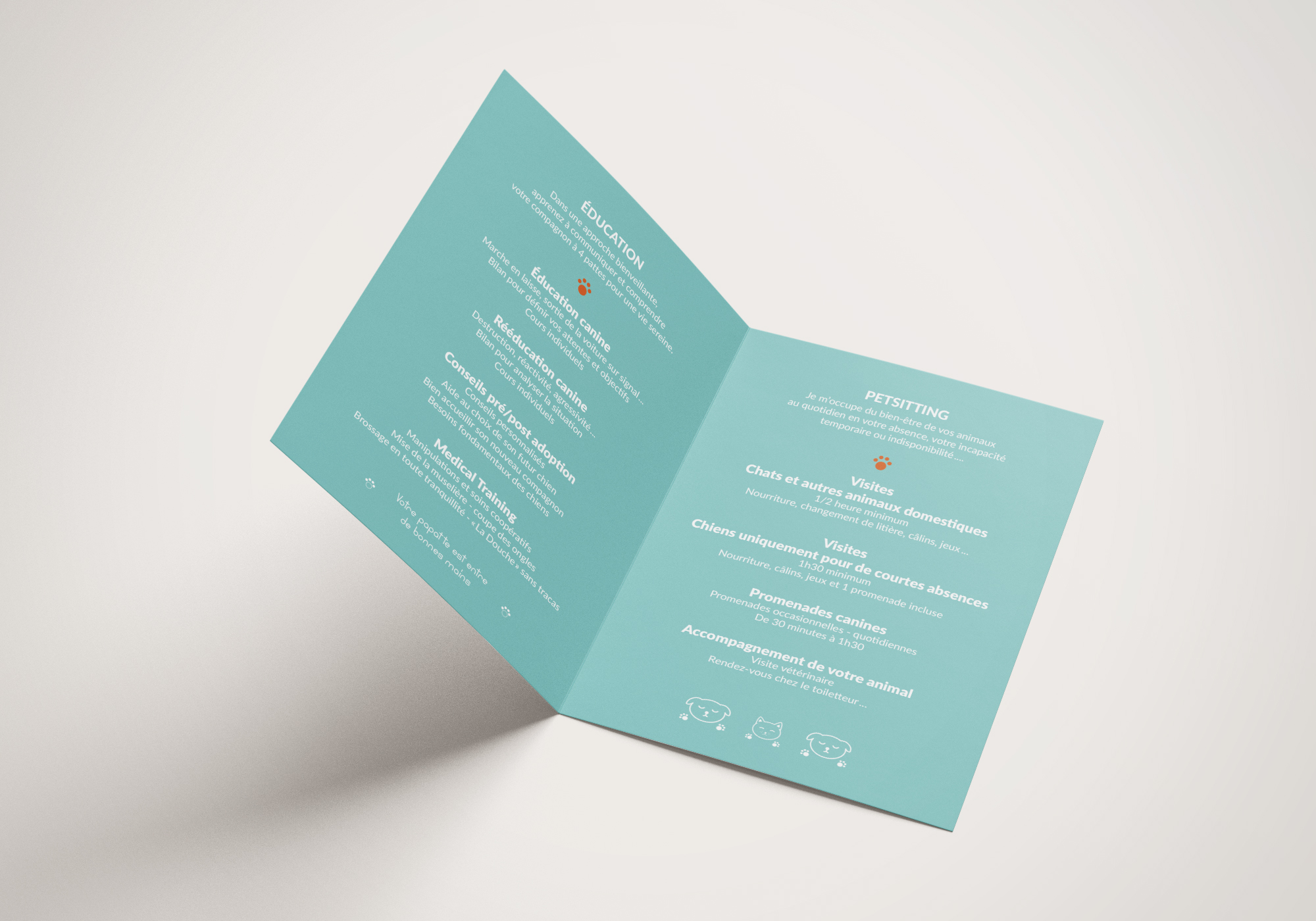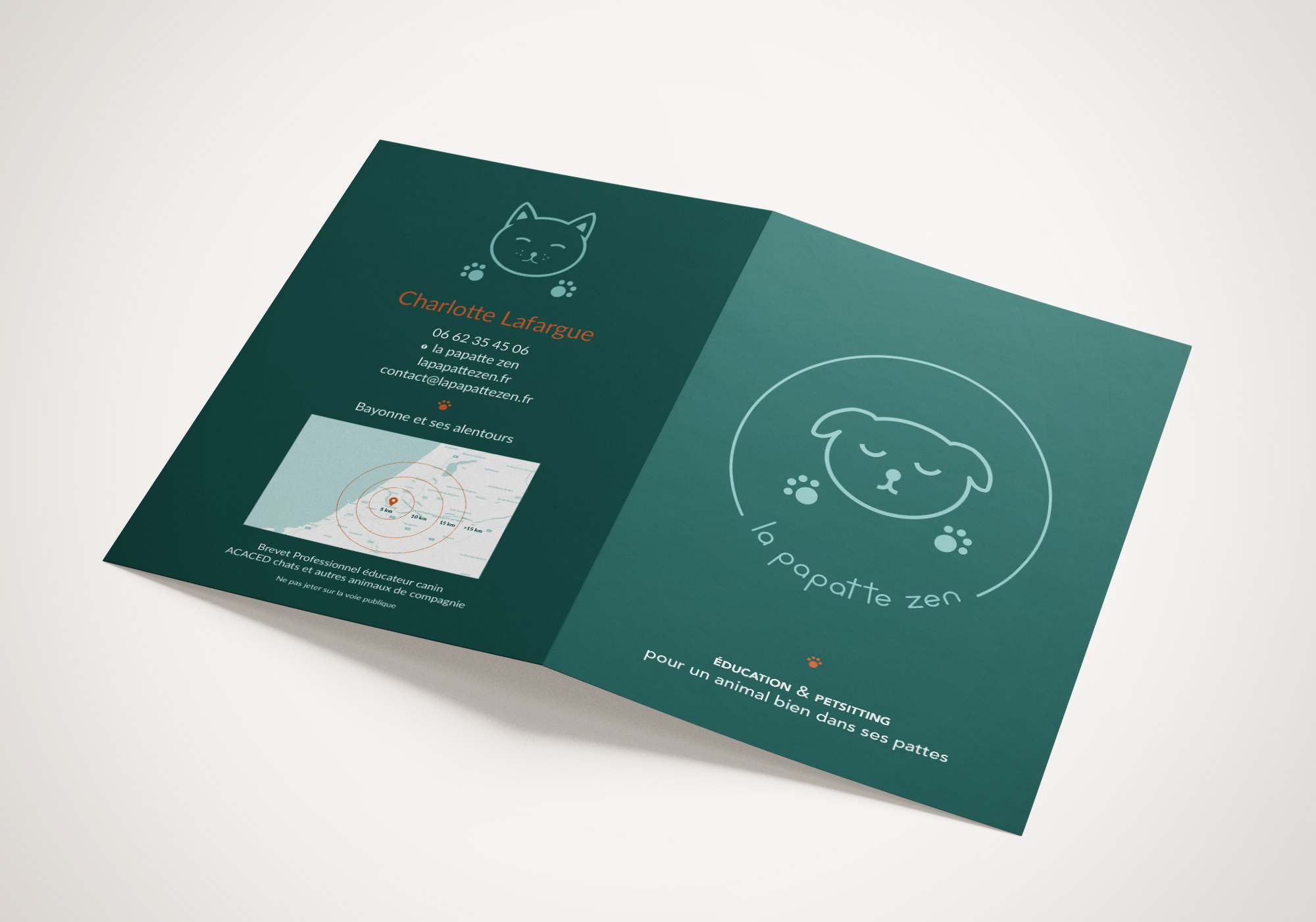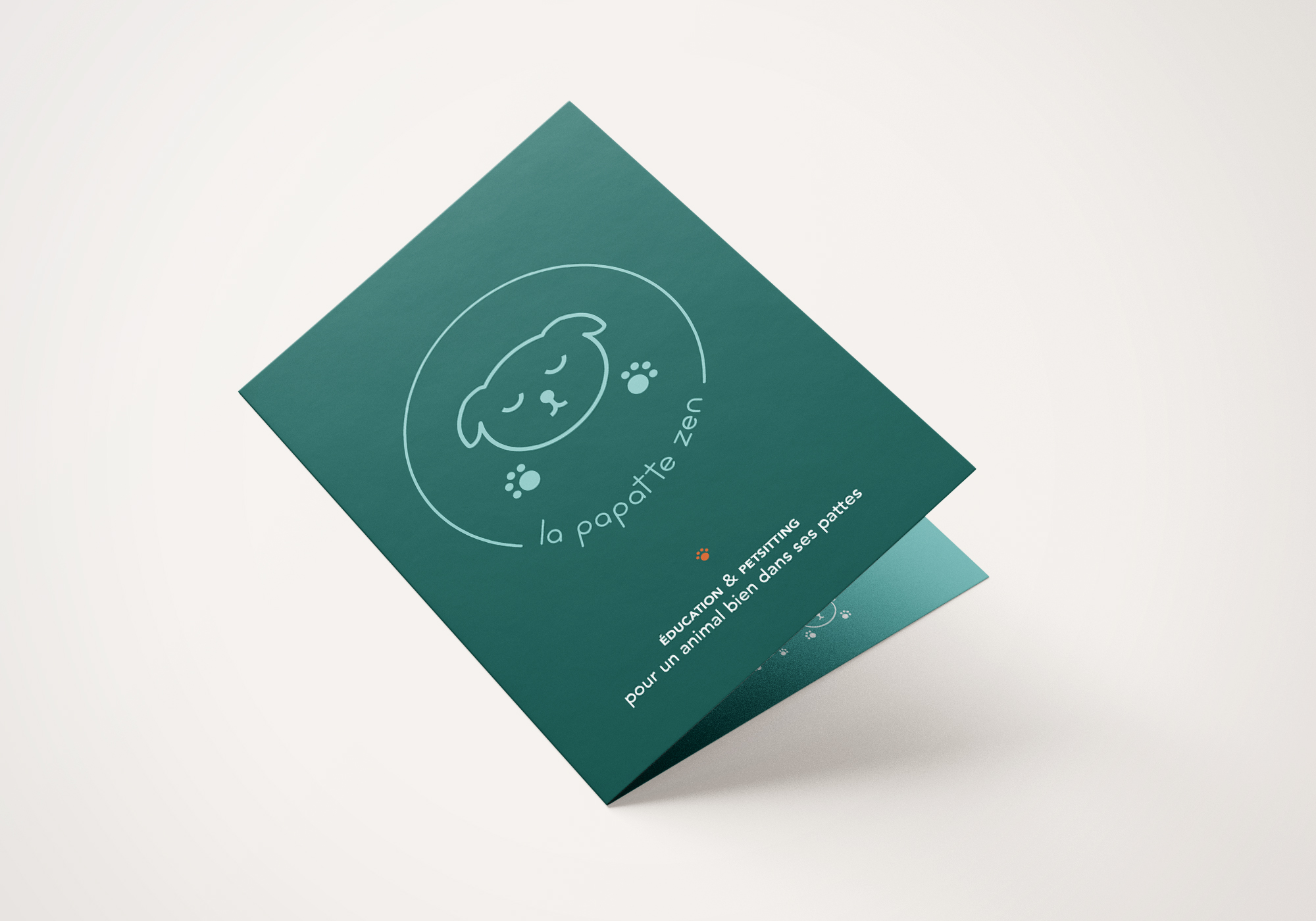 Conception de l’identité visuelle de « la papatte zen », éducation et petsitting pour un animal bien dans ses pattes. La communication se décline sur deux logotypes, une carte de visite et un flyer.
